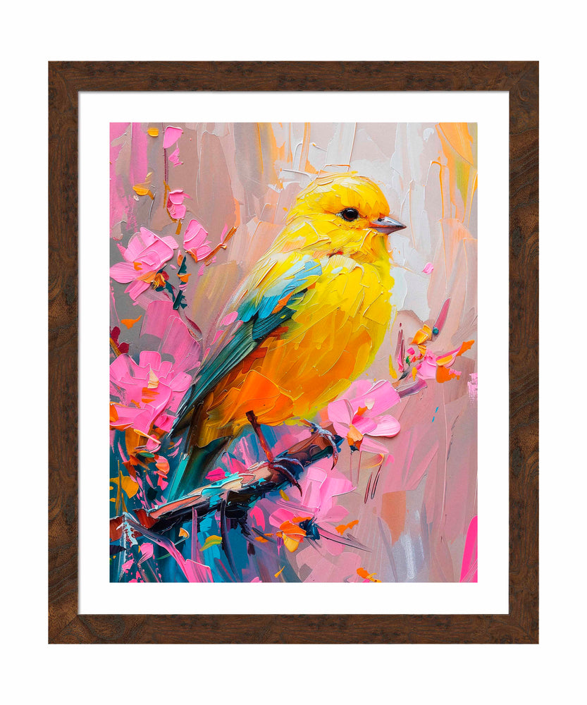 Sunlit Song - Warbler is an exuberant and dynamic painting that captures the radiant beauty of a warbler perched amidst a cascade of vibrant blossoms. The warbler, painted in brilliant shades of yellow with touches of green and blue, stands out against the lively background of pink flowers, all rendered with expressive, textured brushstrokes. The use of bold colors and thick layers of paint creates a sense of movement and vitality, bringing the scene to life.
