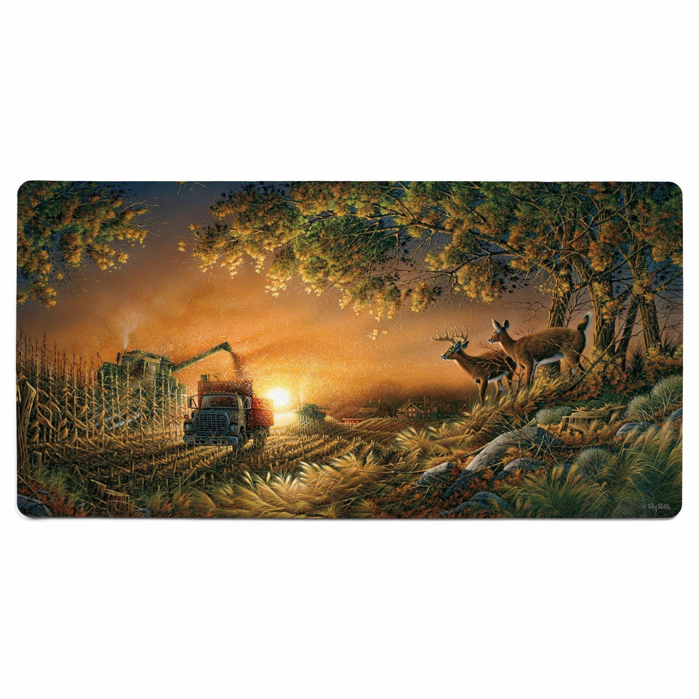 In this classic Terry Redlin image, the local farmer demonstrates both a concern for his wildlife friends and the land he works. As the combines slowly rumble through the field, two rows of corn stalks are left standing. This not only provides winter feed for the deer who wait patiently and unafraid on the nearby knoll, but also serves as a natural windbreak for soil conservation. Careful observers will notice how the artist skillfully captures the subtle effects of light in this romantic scene. As the setting sun’s rays fight through the dust and chaff kicked up behind the combines, its normal bright roundness is both diffused and distorted.