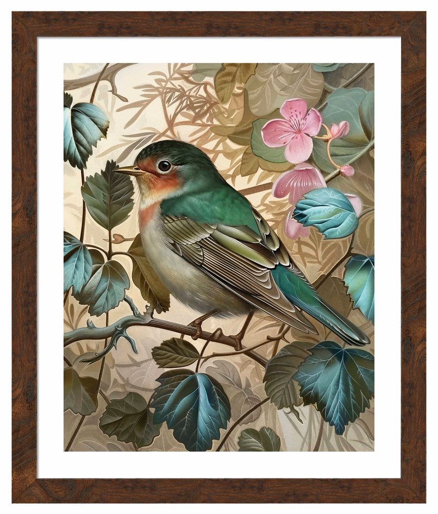 Sweet Melody - Songbird Among Blossoms is a captivating piece from the Sonora Emerald Collection, showcasing the delicate beauty and serene presence of a songbird perched gracefully among lush foliage and blooming flowers. The songbird, with its vibrant green and soft pink plumage, is meticulously detailed, highlighting the intricate patterns and textures of its feathers. The background of rich green leaves and soft pink blossoms adds a harmonious and tranquil ambiance to the composition.