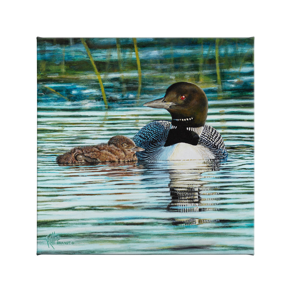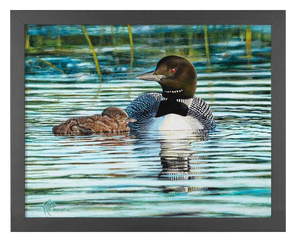 This was such fun to paint both the water/reflections and our beautiful state bird mothering her little Loonchick.