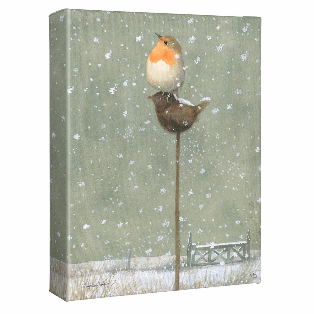 A European robin alights on top of the iron decorative bird that is stuck in the ground in front of my studio. As early as the nineteenth century, when people first started sending Christmas cards to each other, the European robin was frequently featured. A splash of color in a white world, a symbol of hope, warmth.