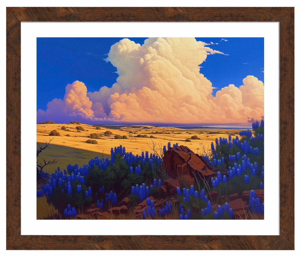 This painting showcases the expansive Texas landscape beneath a vast, cloud-filled sky. The dramatic cumulus clouds, bathed in the warm light of the setting sun, rise majestically against the deep blue sky, creating a stunning contrast. The golden fields stretch into the distance, their subtle variations in tone and texture adding depth to the composition. In the foreground, vibrant bluebonnets stand out against the rich, earthy tones of the rocks, adding a splash of color to the scene. The presence of sparse vegetation and distant silhouettes of trees enhances the sense of isolation and tranquility, emphasizing the vastness of the Texan plains. This piece captures the serene beauty and grandeur of Texas, inviting the viewer to immerse themselves in the quiet majesty of the landscape.