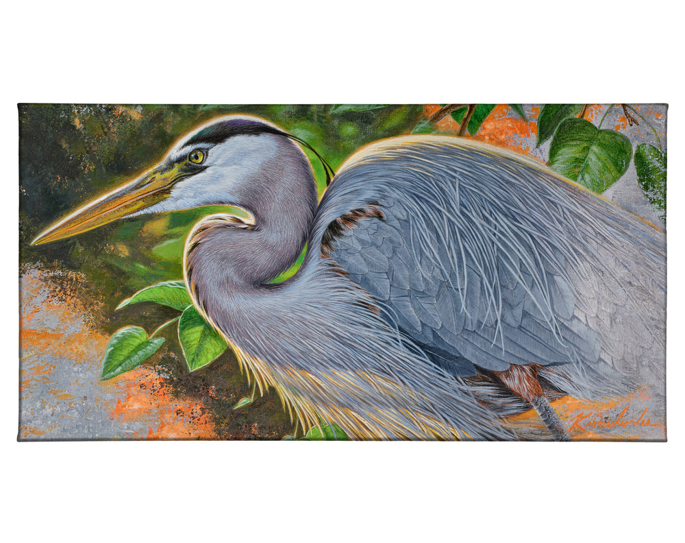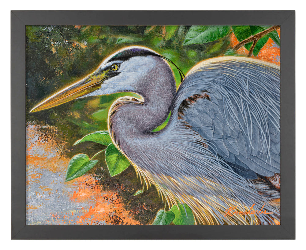 Form follows function as a backlit Great Blue Heron in full mating plumage comes forth from the rough underpainting to contrast with its vividness.