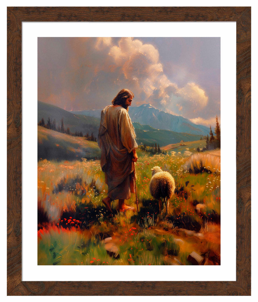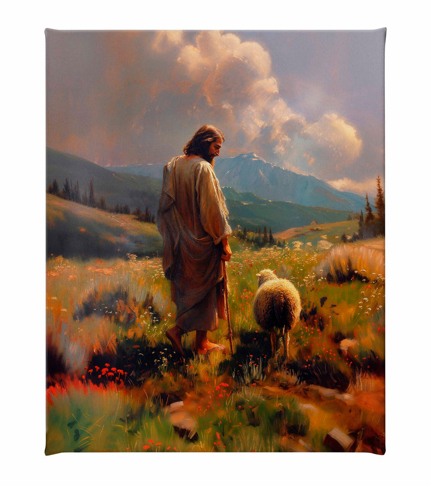 The Good Sheperd is a deeply serene and spiritual painting that depicts Jesus, the shepherd, walking through a vibrant, sunlit meadow alongside a single sheep. His gaze is soft and gentle, filled with compassion, as he looks down at the sheep that follows close beside him.