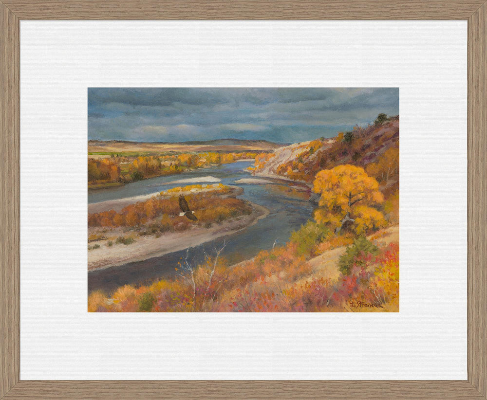 The River in a Golden Mood This is a scene overlooking the Yellowstone river as it rolls by Livingston, Montana. I hike these river bluffs regularly, in all seasons. It is particularly spectacular in the Autumn when the colors are at their peak. I see the resident Bald Eagles very often on my walks and it seemed appropriate to include one in this landscape. The Yellowstone is a National treasure, and I am grateful to live so close to it.