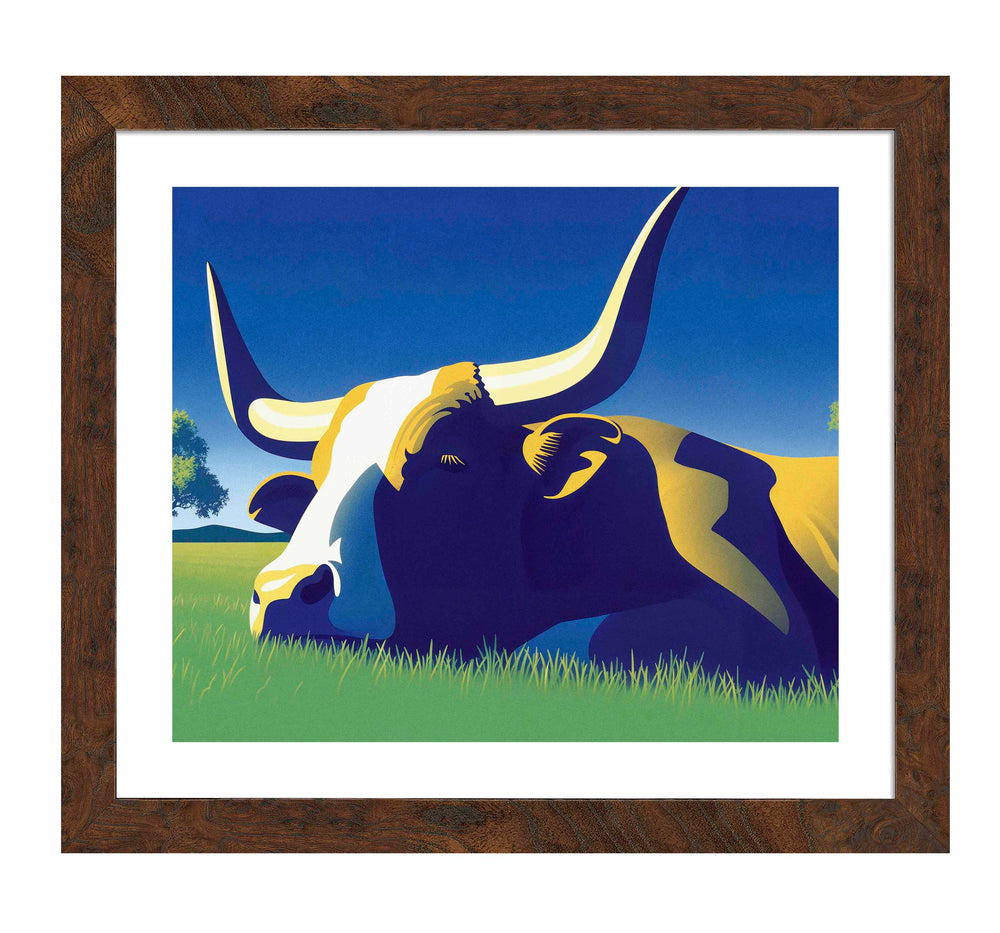 "The Sleeping Giant" is a serene and captivating portrayal of calm strength, embodied by a resting longhorn. The composition centers on the tranquil figure of a massive bull lying peacefully in a sunlit pasture. Its grand horns, striking in their size and curvature, dominate the image, giving the bull a sense of quiet majesty even in its repose. The smooth, geometric lines of the longhorn’s form are rendered in bold, contrasting shades of deep blue, golden yellow, and crisp white, capturing the animal’s powerful frame with a modern, minimalist aesthetic.