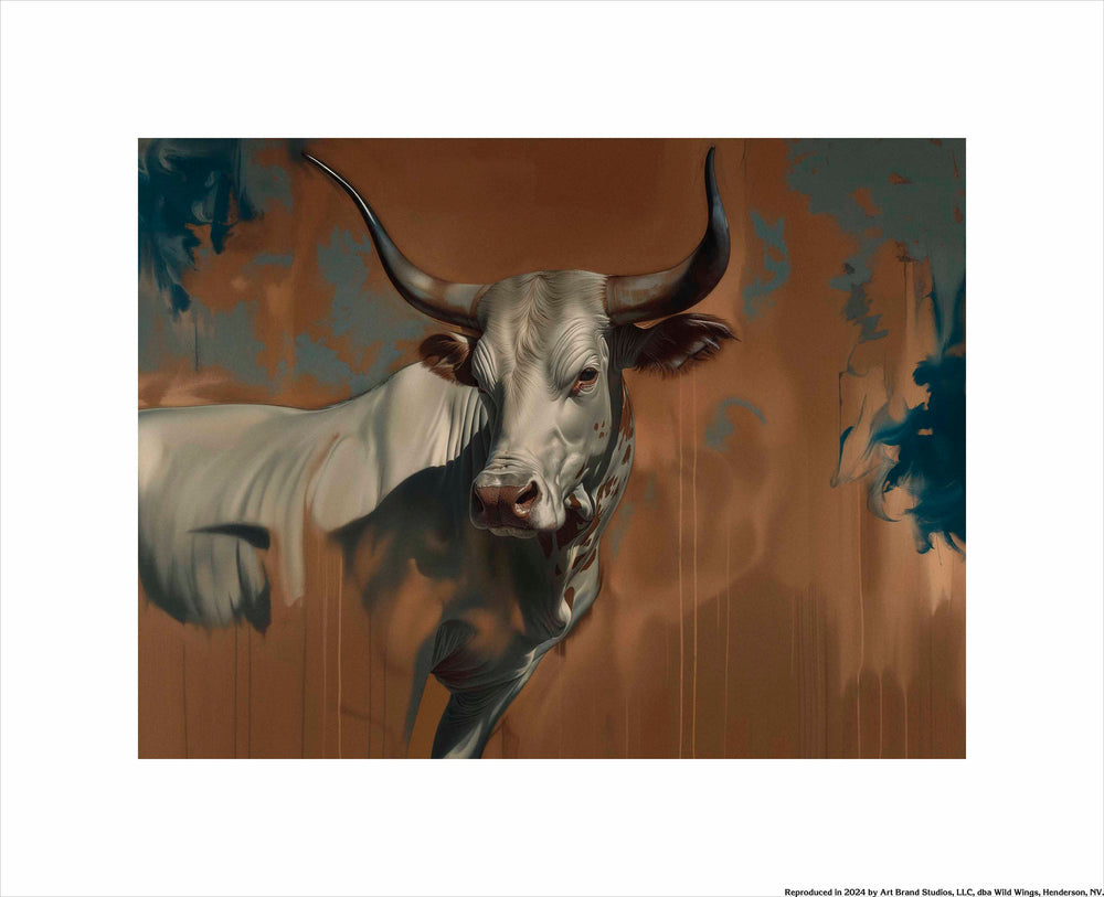 "The Texan Colossus" is a powerful depiction of a longhorn steer, rendered with stunning realism and an almost mythic presence. The central figure, the steer, is captured in mid-motion, its muscular form emerging from a rich, earthy background that hints at both the rugged landscapes of the American Southwest and the untamed nature of the animal itself. The interplay of light and shadow on the steer's body creates a dynamic sense of movement, while the subtle blending of colors in the background adds depth and a sense of mystery.