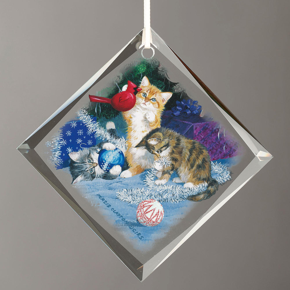 Painting of three rambunctious kittens having a grand old time playing with Christmas decorations under the Christmas tree.