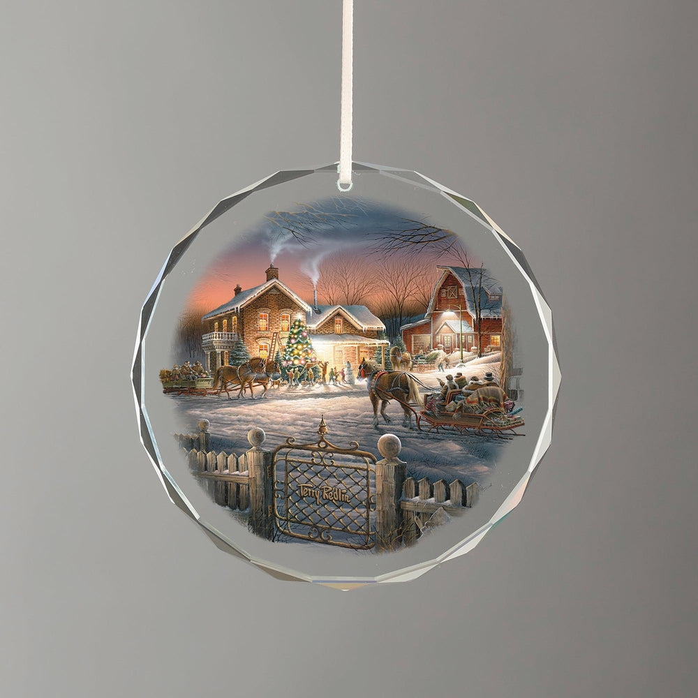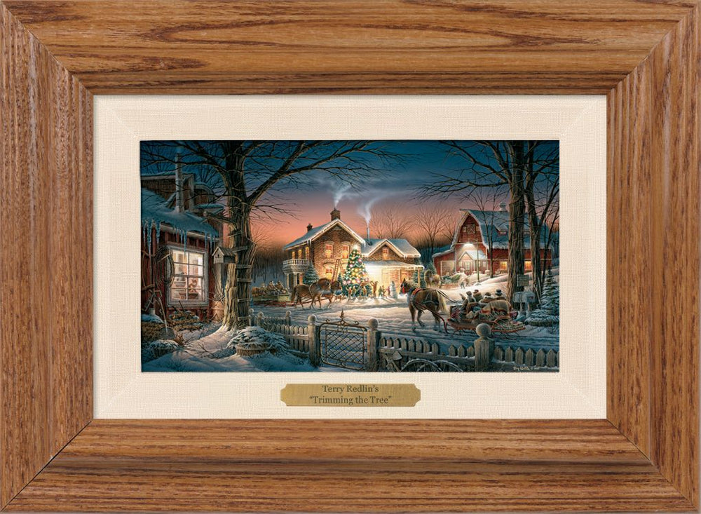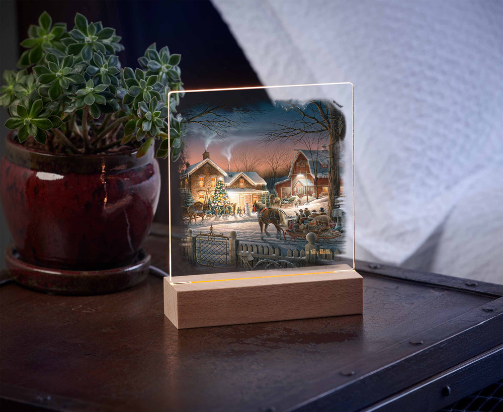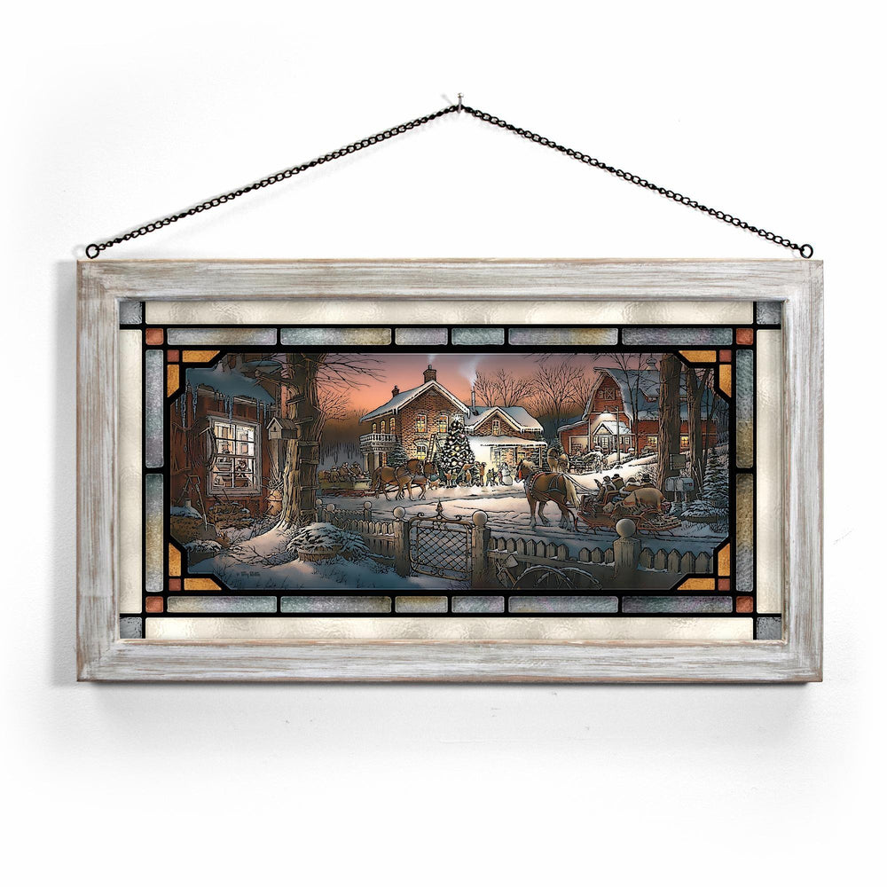 In this festive holiday scene, we can almost feel the crisp winter air, hear the children’s gleeful shouts, and share in the excited anticipation of arriving visitors. Off to the left, a cat in the lighted window ignores the action outside – she has her eye on a rabbit hiding in the shadows.