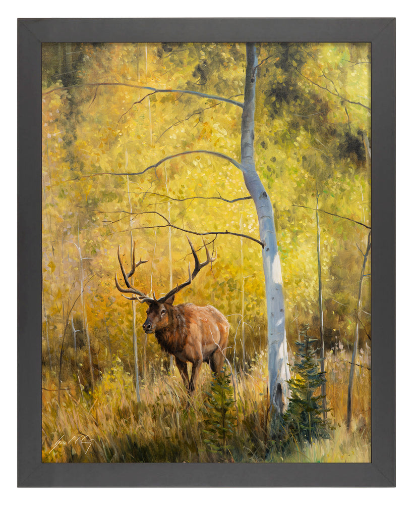 Where I live in New England, in the White Mountains region, we have abundant birch trees and are known worldwide for our fall colors, with the birch turning that distinctive yellow. The trunks of birch trees are truly white, whereas Aspen trees appear to be white with a green tint underneath. I like to paint both but there are subtle color differences that make Aspen more pleasing to paint. Everything takes on a soft greenish yellow under the canopy of the aspens. This painting is all about the Aspens. I chose an elk because the antlers remind me of branches.