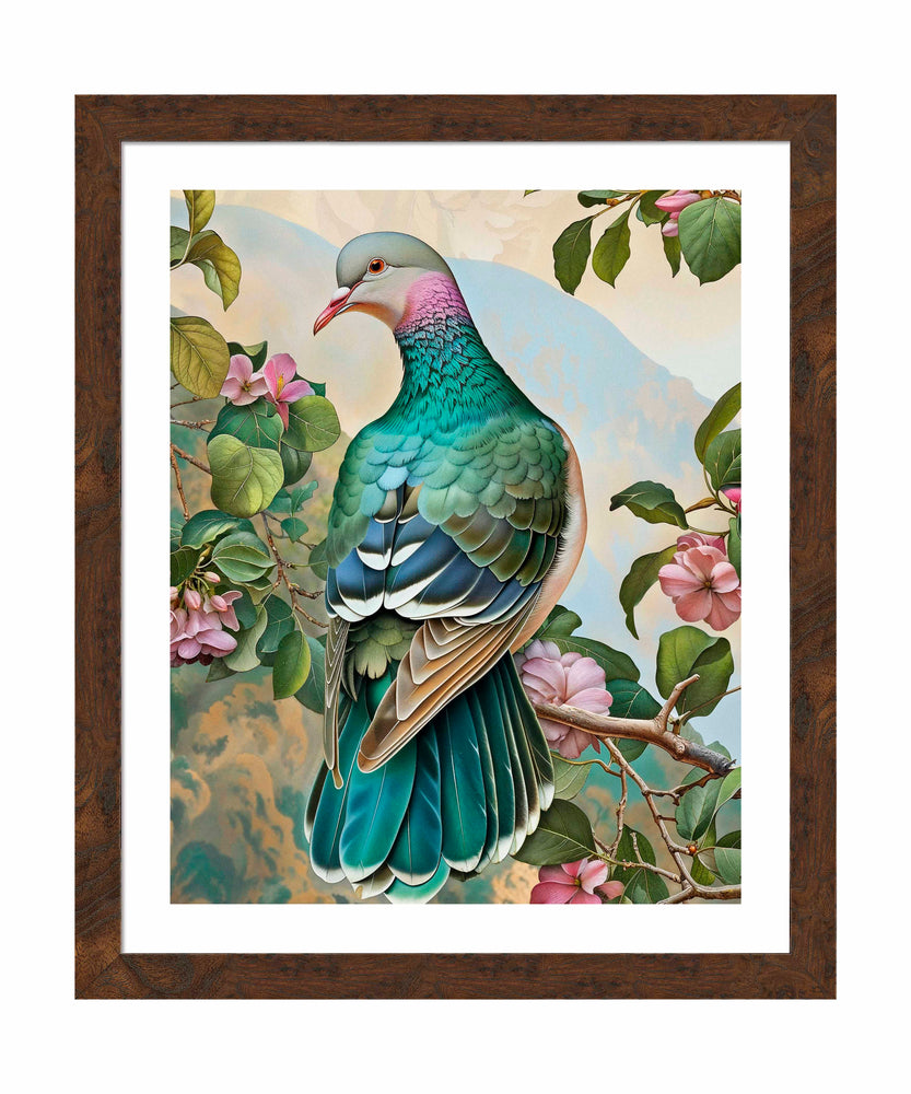 Verdant Splendor - Dove Amidst Blossoms, part of the Sonora Emerald Collection, showcases the serene elegance and vibrant beauty of a dove perched delicately among blooming flowers. The dove's plumage, depicted in an exquisite palette of greens, blues, and soft purples, is intricately detailed, highlighting the bird's graceful form and the iridescent quality of its feathers. The surrounding blossoms and lush foliage create a harmonious backdrop, enhancing the dove's natural charm.