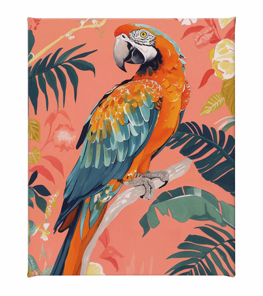 Vibrant Echoes - Macaw is an exhilarating celebration of the colorful and lively essence of tropical wildlife. This painting features a magnificent Macaw, perched proudly amidst a lush array of tropical leaves and flowers. The Macaw's vibrant plumage, with its brilliant hues of orange, blue, and green, stands out vividly against the warm, coral background, creating a striking visual impact.