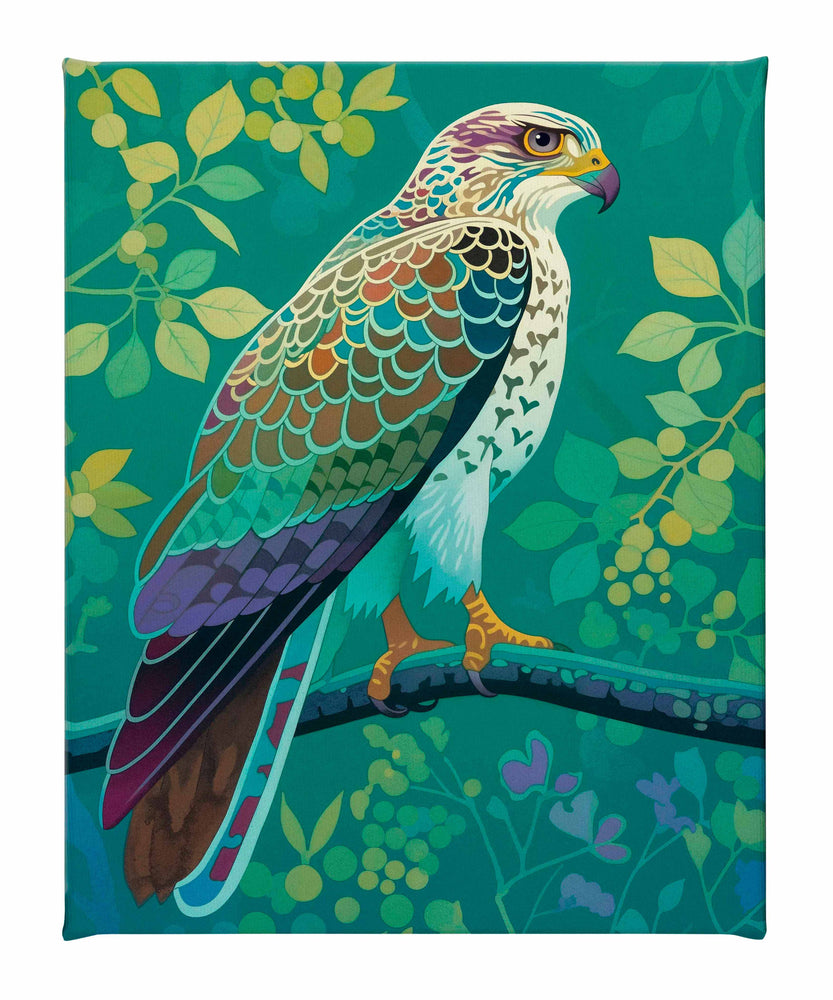 The artist's use of a rich, saturated color palette creates a sense of depth within the foliage. The contrasting hues and intricate patterns draw the viewer's eye, making the hawk the undeniable focal point of the composition. The lush background, with its varied shades of green and hints of yellow and purple, adds to the overall sense of vibrancy and natural beauty.