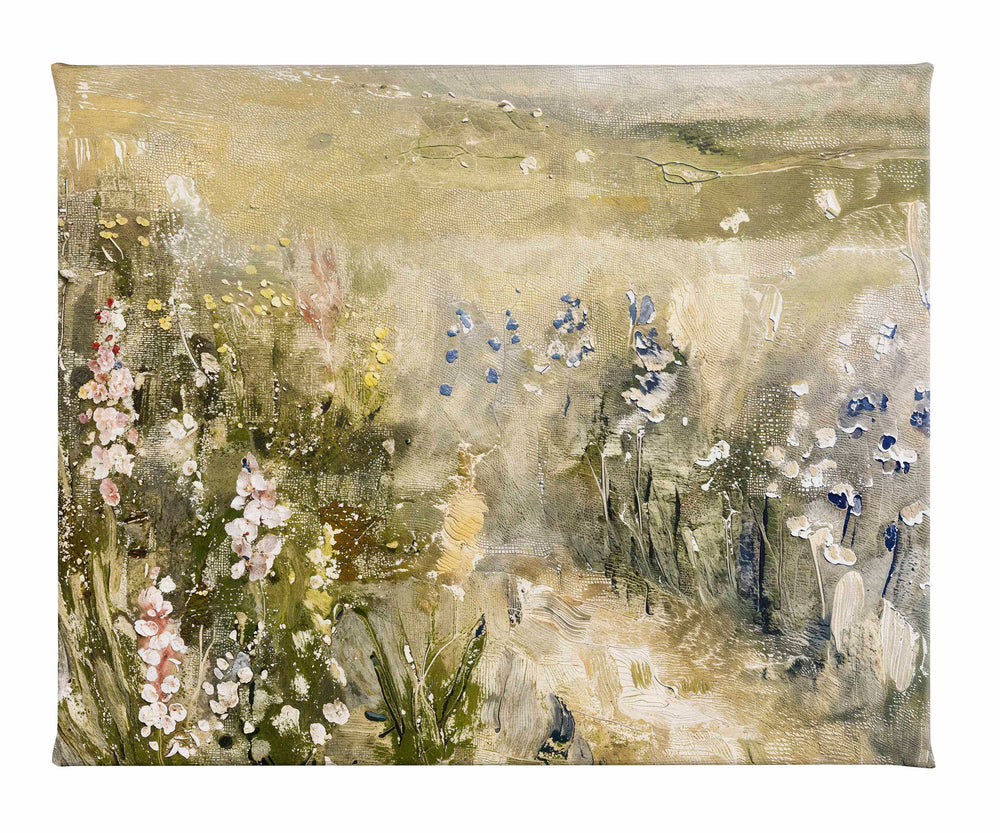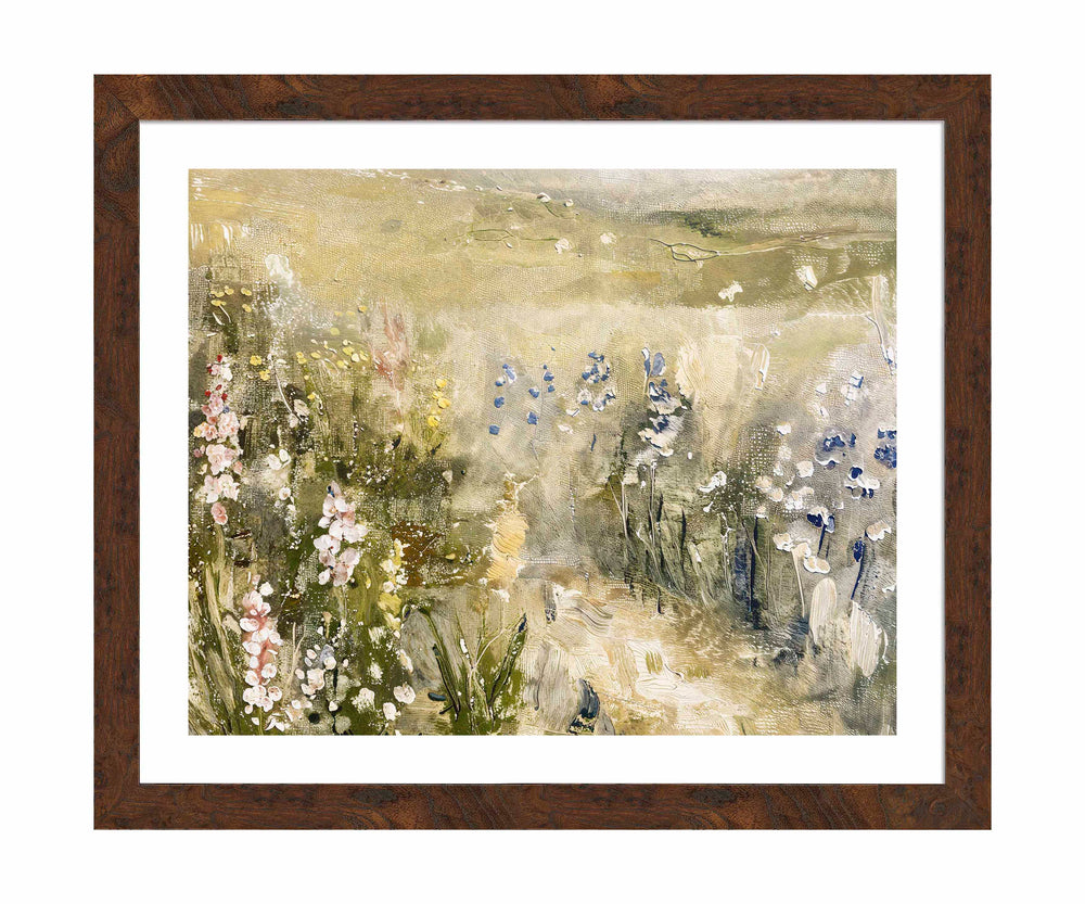 "Visions of Remembrance II" invites viewers into a quiet, almost nostalgic landscape, where nature's beauty is captured in soft, impressionistic strokes. The composition centers around a blooming meadow, where muted greens and soft creams blend seamlessly with bursts of delicate pinks and blues, suggesting wildflowers swaying gently in a breeze. The palette is understated yet full of life, with the natural hues creating a serene and peaceful atmosphere.