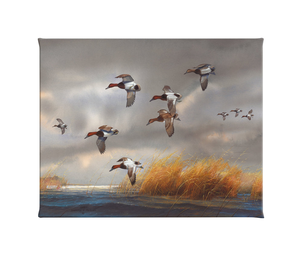 To see Canvasbacks descend upon the waters of a secluded bay is the highlight of a fulfilling year. Their sloping heads and bright plumage make a striking image to paint, and a lasting memory if blessed to add one to his annual harvest.