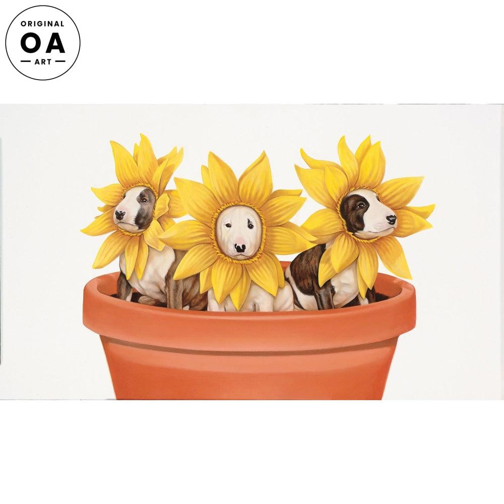 Three Bull Terrier puppies are dressed up as sunflowers and sit in a giant flower pot.