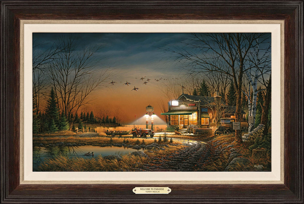 The store owner in this backwoods retreat is a true entrepreneur, offering everything a sportsman might need: cane fishing poles, decoys, guns, shells, fuel, refreshments, groceries. While the visiting hunters are inside stocking up, the main action appears overhead as a flock of mallards set their wings in break and flutter down for a night's rest. Notice the pole flag at the rear of the jeep. Personal experience has informed the owner that vehicles left in high grass can be easily misplaced after the day's hunt. Careful observers also will see the tree sign listing the population of Paradise at thirteen. This includes the dog resting in front of the store, but does not imply any bad luck for sportsmen who have found their way to Paradise.