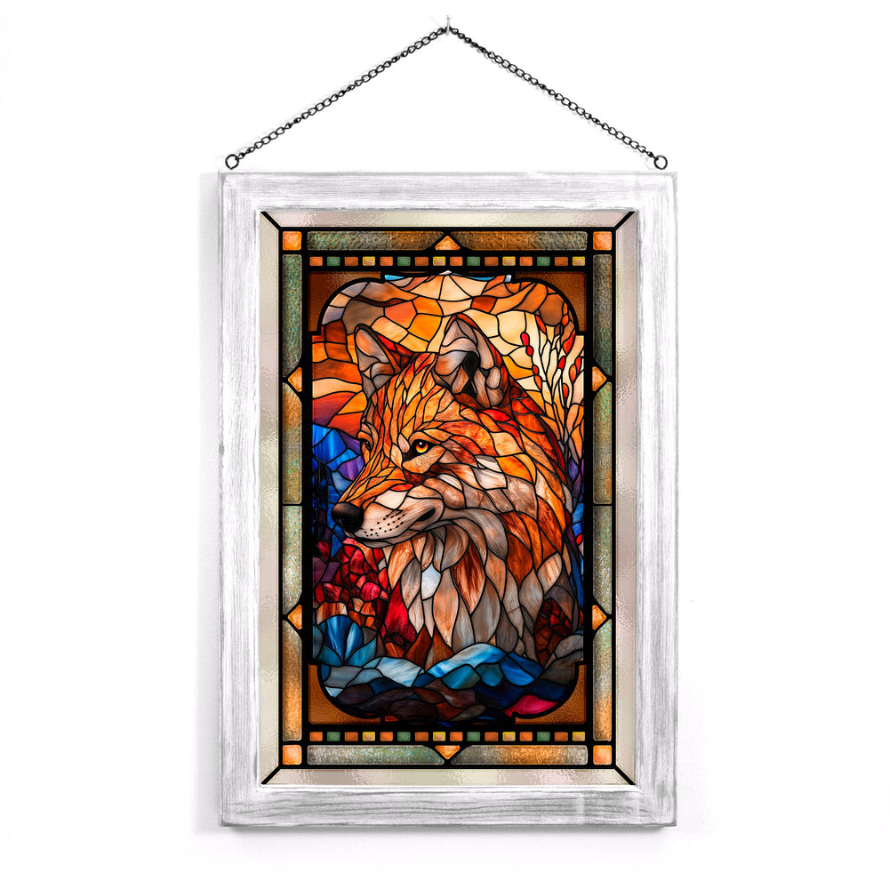 "Winter's Soul" captures the essence of resilience and wisdom through the striking image of a wolf set against a vibrant winter backdrop. Rendered in a stained glass style, the warm amber and russet tones of the wolf’s fur harmonize with the fiery hues of a setting sun, contrasted by cool blues and purples of the surrounding snow and sky. This artwork evokes the untamed beauty and enduring spirit of nature in winter.