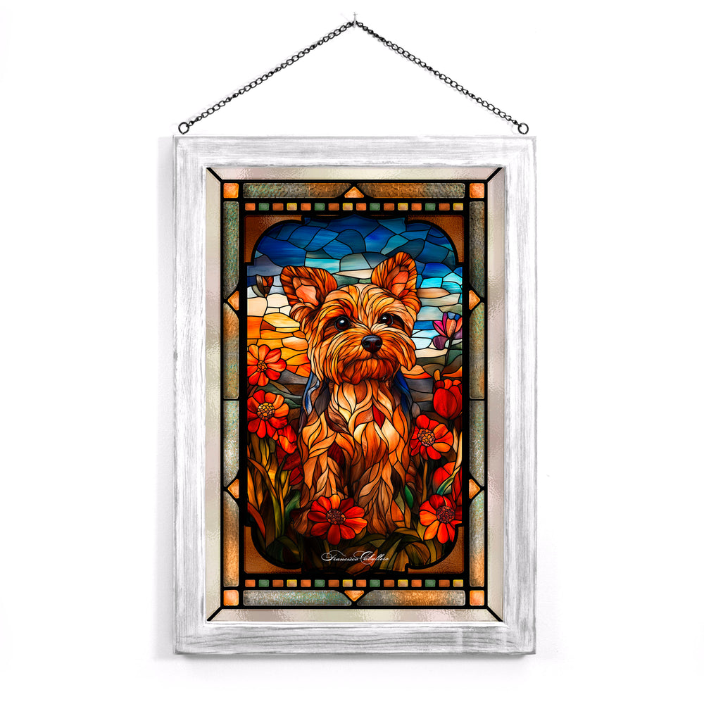 "Yorkshire Terrier" captures the spirited and elegant essence of this beloved breed through a dazzling stained glass-inspired design. The Yorkie is portrayed amidst vibrant red and orange blooms, with intricate details that highlight its silky coat and expressive, playful eyes. The warm hues of a glowing sunset and a tranquil countryside backdrop create a harmonious balance between the dog's lively personality and the serene natural setting. This artwork celebrates the Yorkshire Terrier’s charm and grace, blending its distinctive features with a radiant and timeless depiction of beauty in nature.