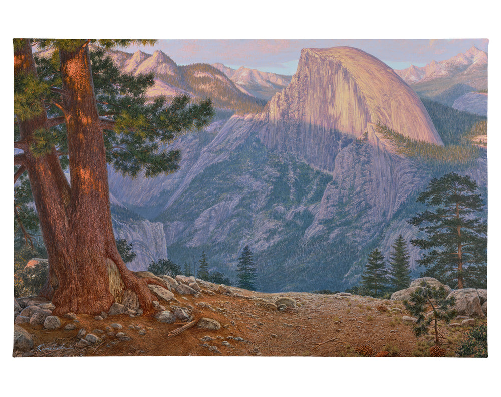 On the longest day of the year, golden evening light falls on the face of Half Dome as cool shadows rise four thousand feet up out of Yosemite Valley.