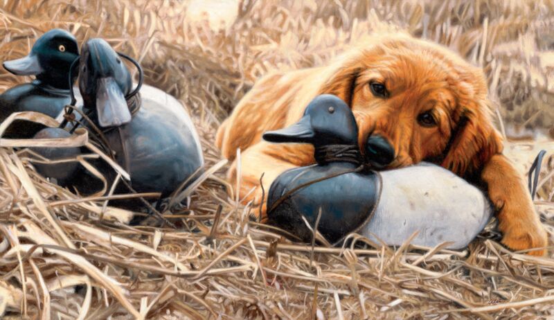 A golden retriever puppy chewing on a decoy while waiting to hunt.