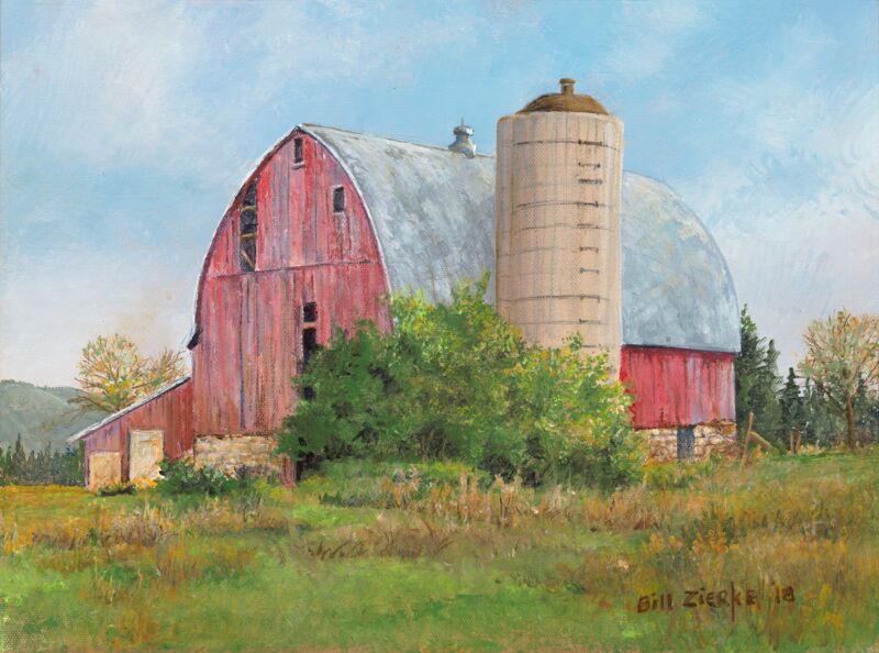 Original acrylic painting featuring a red barn by Bill Zierke.