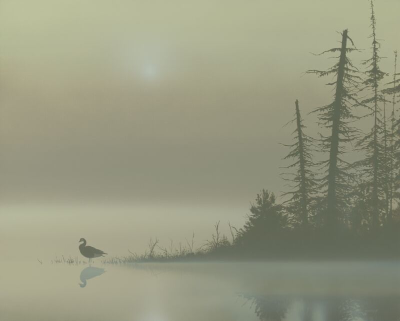 A solo Canada goose sits amidst a quiet, misty, northern landscape.