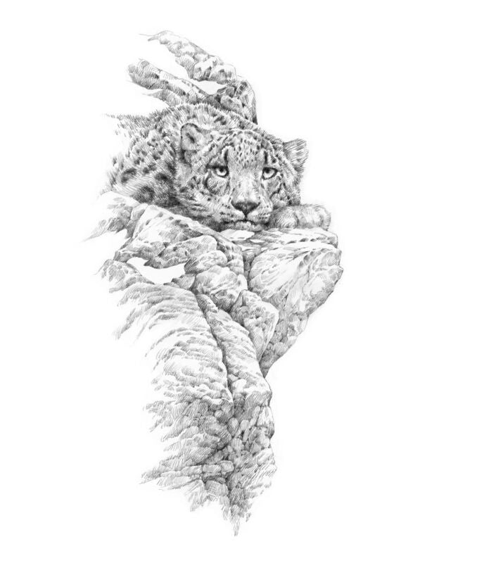 Original pencil (graphite) drawing of a snow leopard relaxing on a rocky...