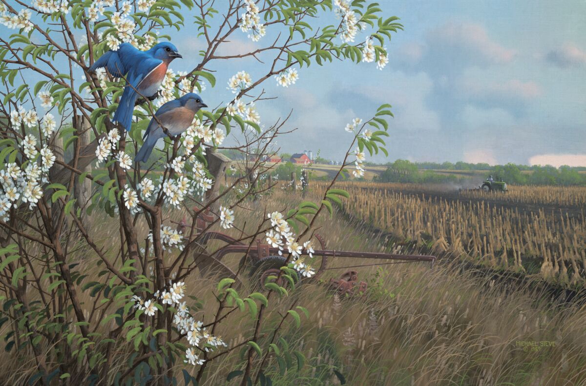 "Spring Symphony - Warbler Among Blossoms is a vibrant and expressive painting...