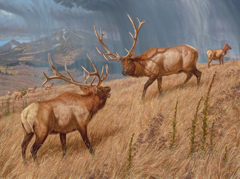 Two majestic bull elk challenging each other as a thunderstorm brews over...
