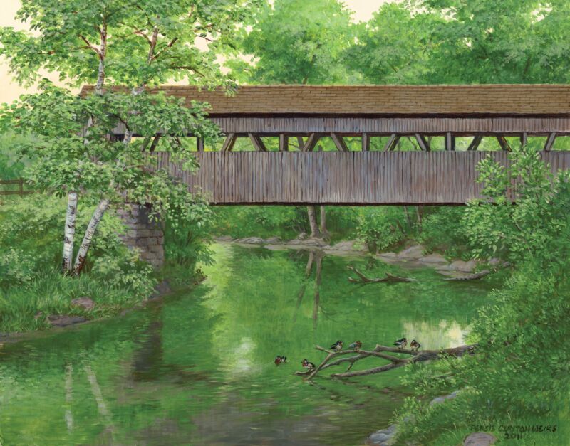 An old-fashioned covered bridge over a stream where wood ducks are congregating.