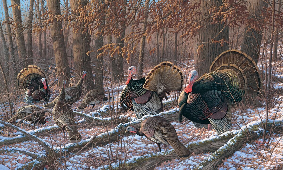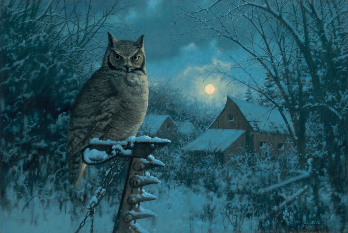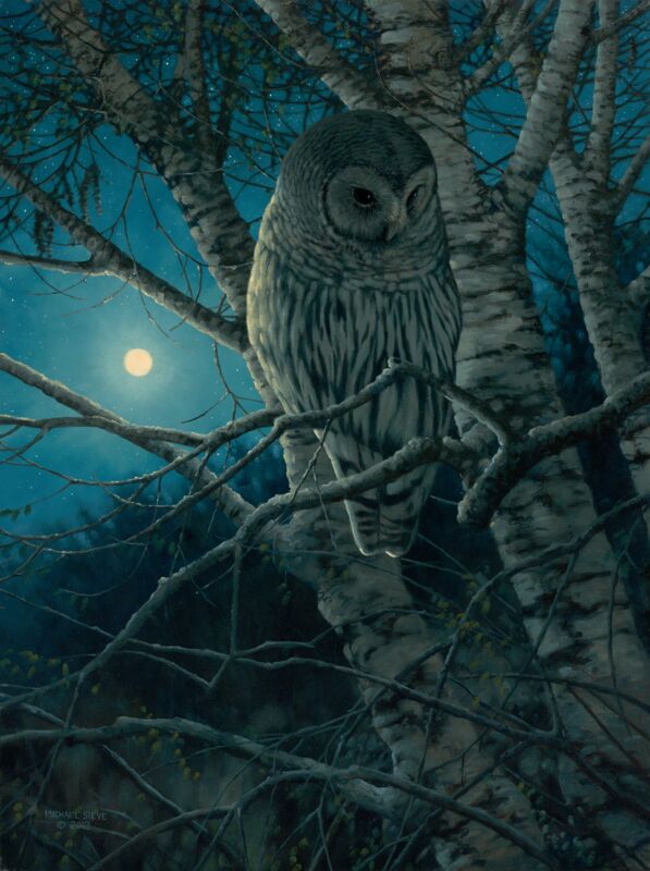 This painting depicts an owl surveying the woodland terrain at night. It...