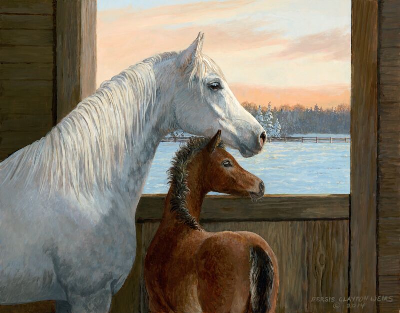 A mare and her foal looking out their barn window and patiently...