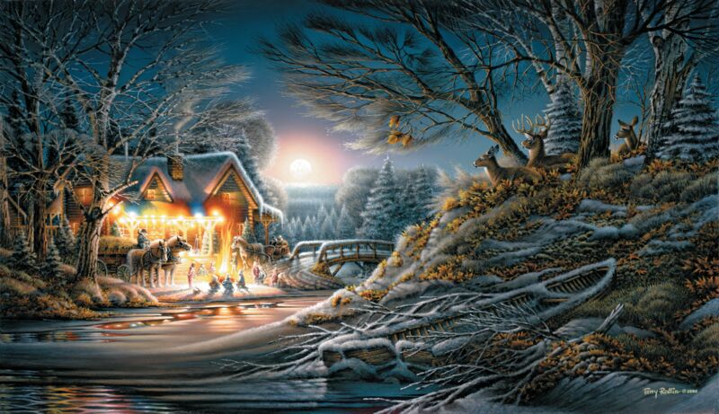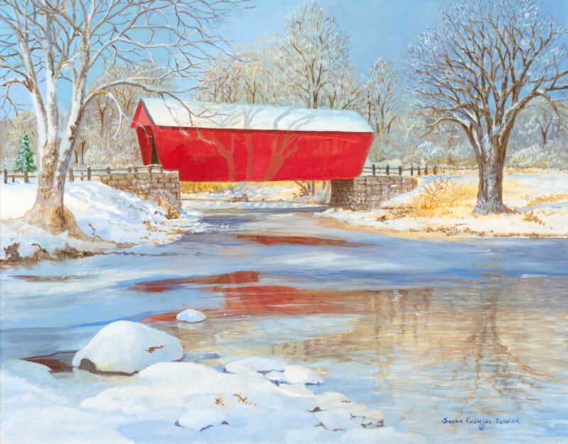 A covered bridge and frozen creek in winter by Susan Knowles-Jordan.