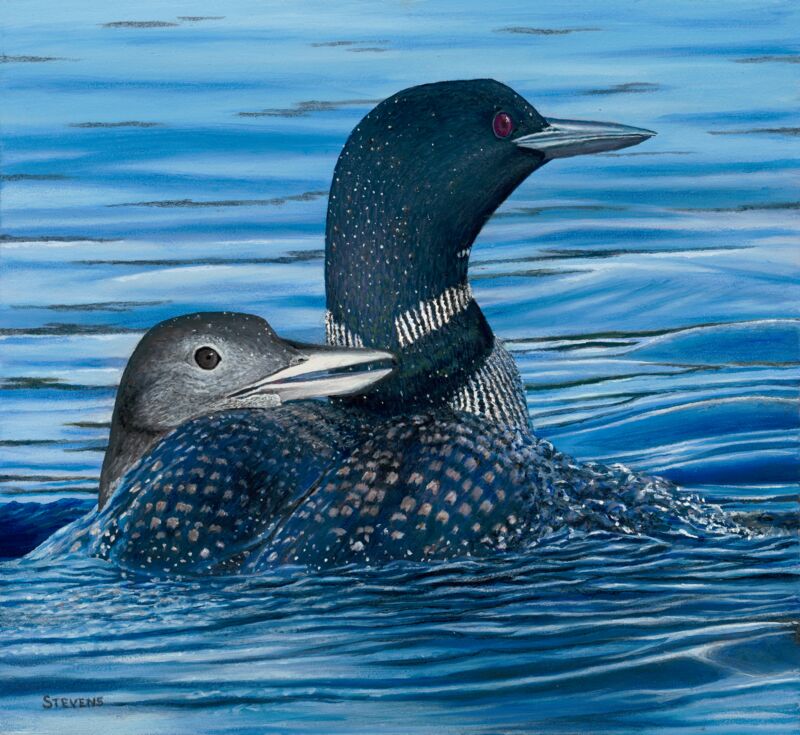 Original oil painting featuring two loons by Gene Stevens.