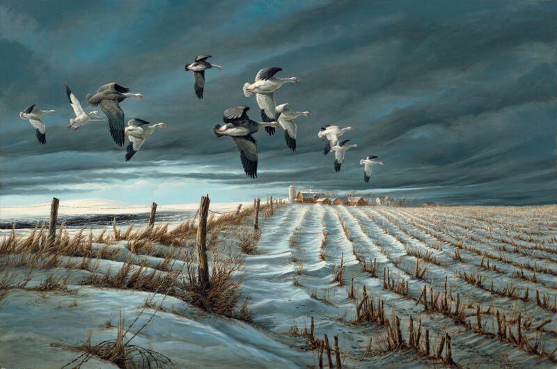 “Snow geese, dramatically contrasted against a dark and foreboding sky, fly over...
