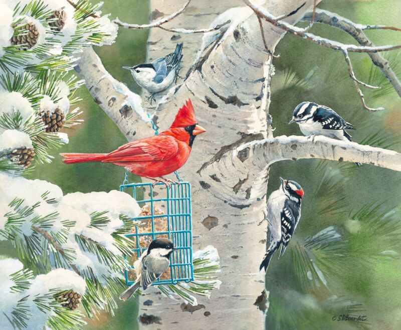 "Winter's Bold Note" features a vibrant cardinal perched on a frosted branch...