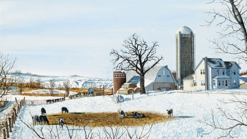 The golden glow of a winter dawn after a fresh snowfall creates...