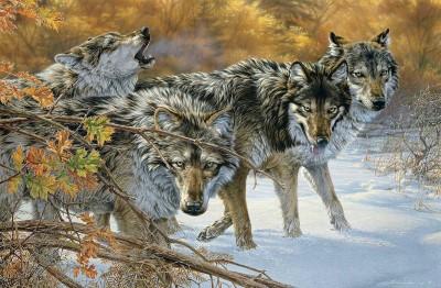 Well protected in their heavy winter coats, the wolf pack stops for...