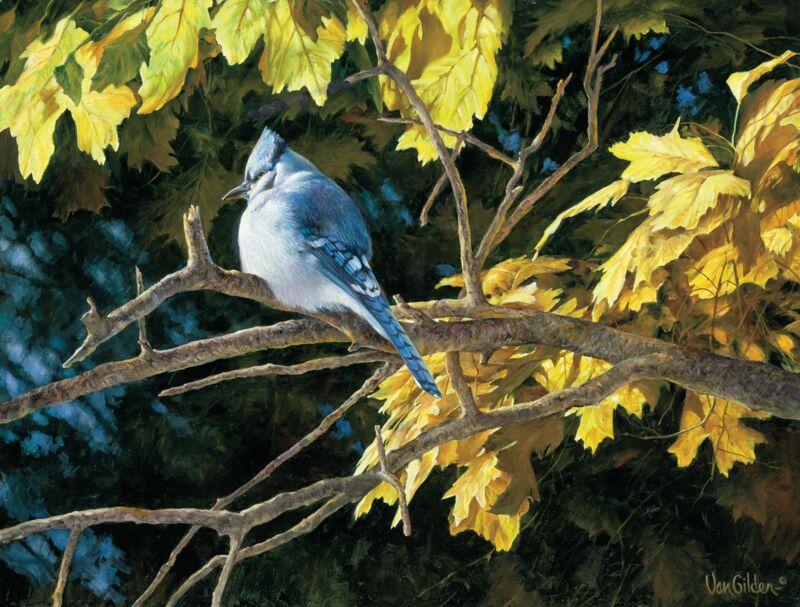 A male blue jay resting on a maple tree branch surrounded by...