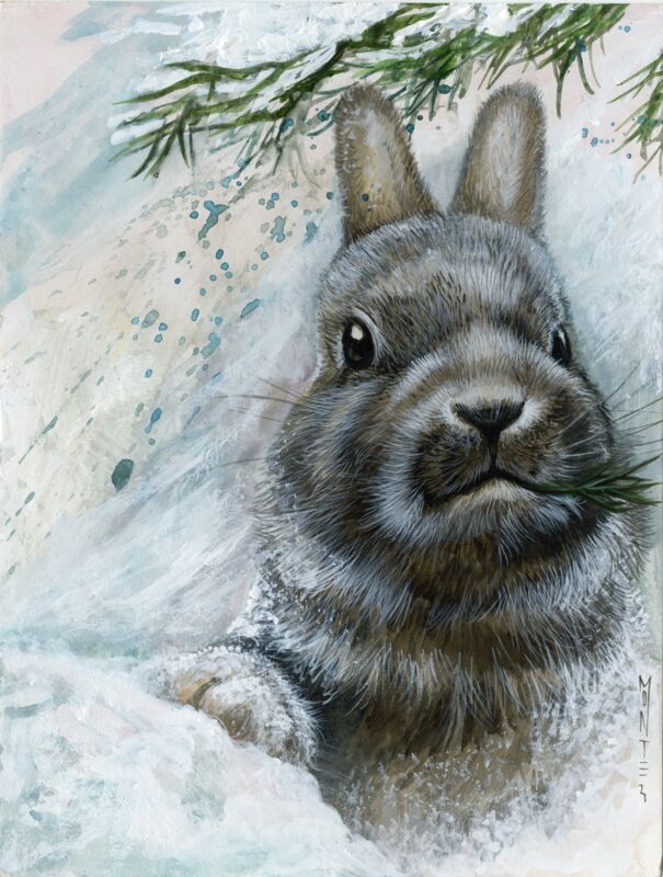This painting depicts two horses keeping each other company in a snowy...