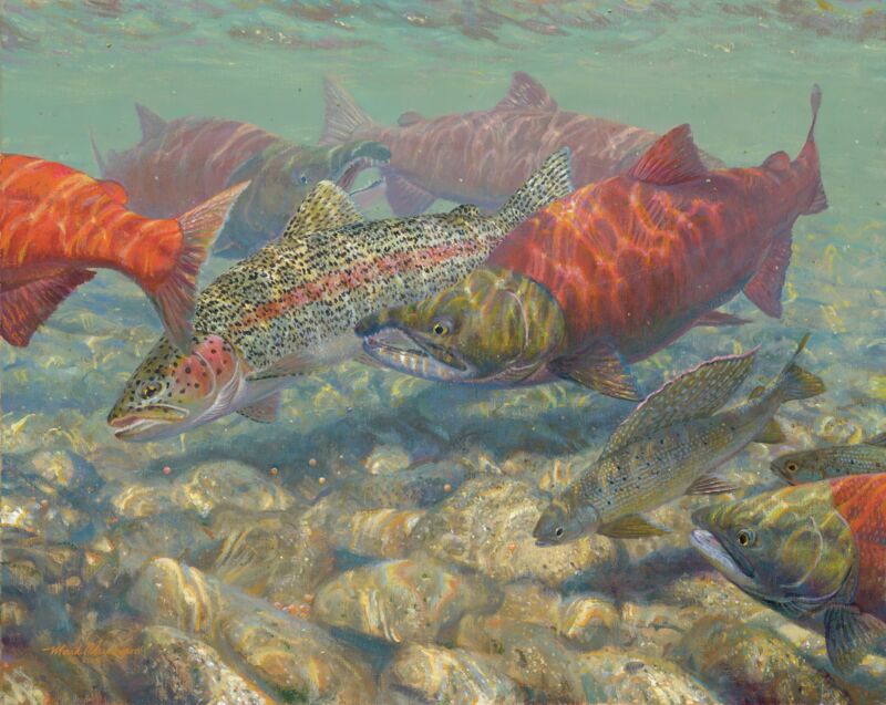An underwater drama plays out as spawning sockeye salmon circle the redd...