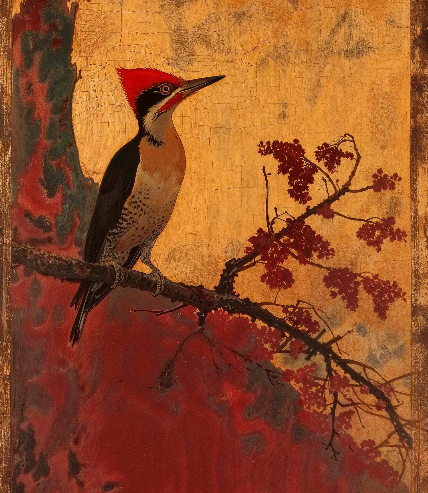Echoes of Silk - Woodpecker in Autumn Splendor