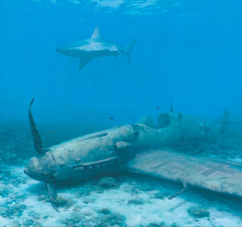 The ubiquitous sandbar shark patrols the wreckage of a sunken German aircraft...