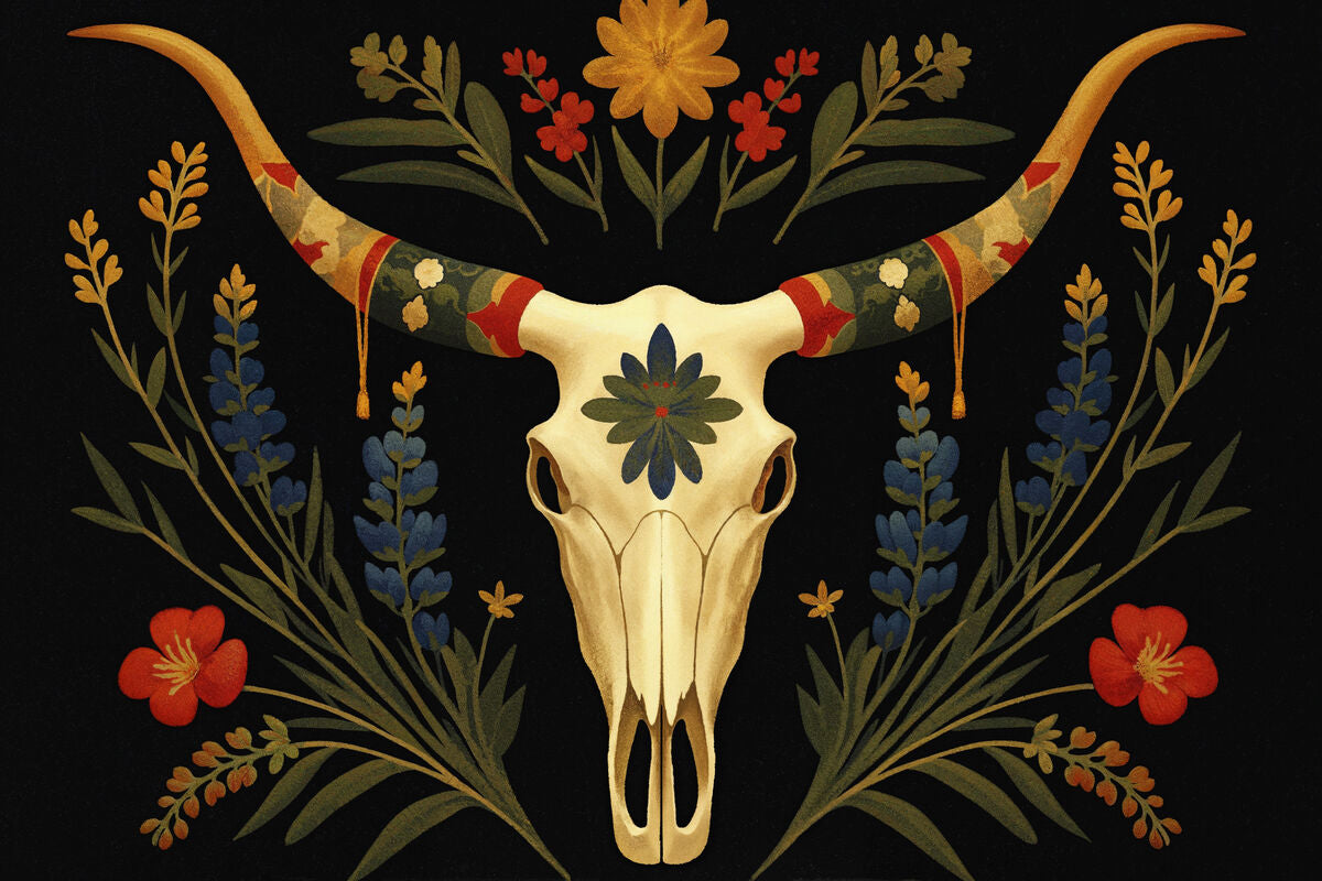 Surrounding the longhorn skull, vibrant bluebonnets and golden wildflowers bloom upward, weaving...
