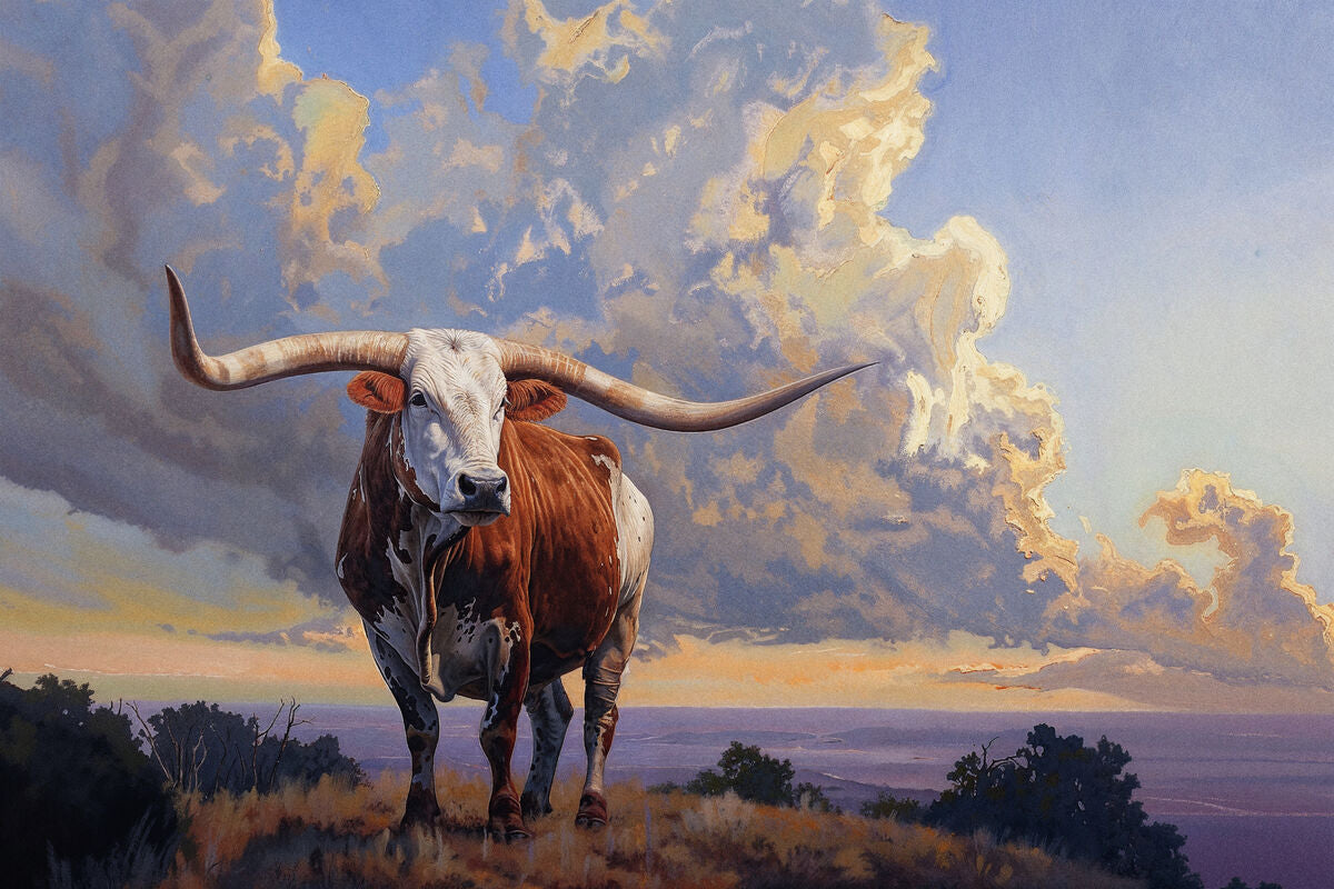 "Hill Country Monarch I" captures the majestic presence of a longhorn, a...