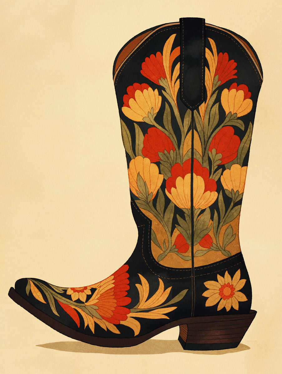 "Honky Tonk Heels" features a striking cowboy boot richly adorned with vibrant floral...