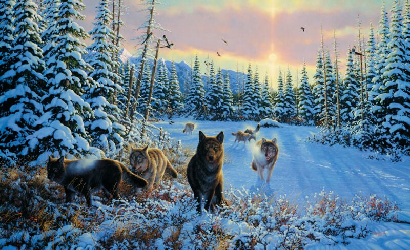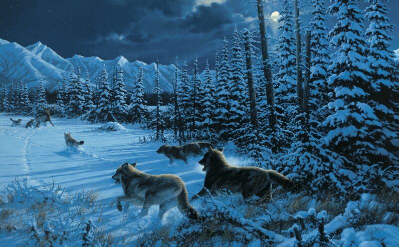 “Under the Northern Lights' mysterious shapes, the wolves travel for miles, single...