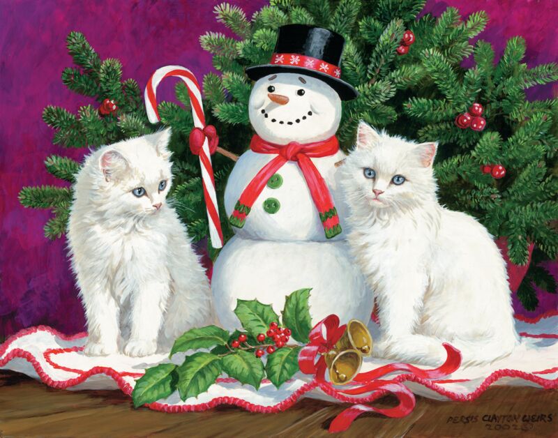 Two white kittens sitting beside a holiday decoration shaped like a little...