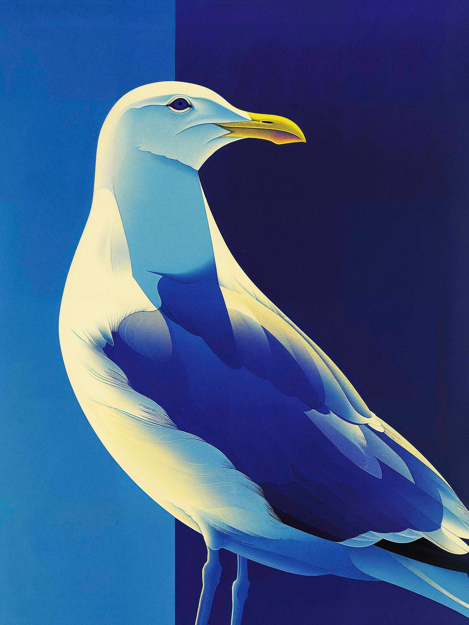 "Luminous Sentinel - Seagull in Azure Light is a striking painting that...